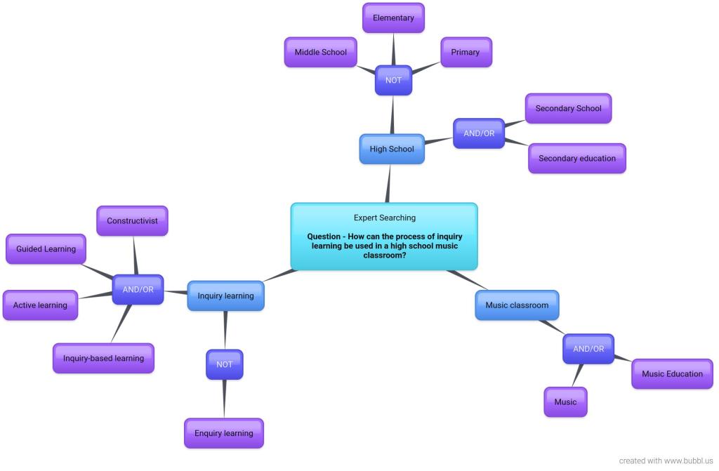 Inquiry learning in the music classroom has interested me for some time. Taking my specific context of high school, I decided to focus on the following question “How can the process of inquiry learning be used in a high school music classroom?”.  Keywords, phrases and synonyms were identified to narrow the searches and results.
