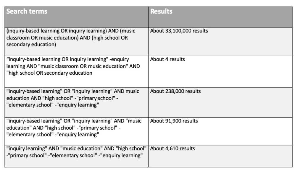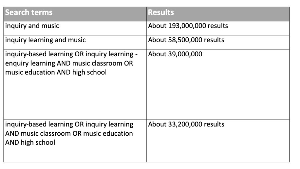 The Boolean search method assisted in narrowing down the search results and I was able to find relevant resources related to my question.  The search of “inquiry-based learning OR inquiry learning” -enquiry learning AND “music classroom OR music education” AND “high school OR secondary education returned 4 results.  Even though it could be thought that this is a great search with targeted results, the content within the results were not relevant to the question and my continued learning.  Another strategy used within the Google search was brackets and quotation marks. These two small changes to a search term allow Google to return results using the specific words together within the quotation marks or brackets allowing for a more accurate result.  For example, searching inquiry learning and music within Google returned 49.7 million results, while searching “inquiry learning” and music returned 1.43 million. The quotation marks grouped inquiry learning together as a phrase rather that inquiry and learning separately. The search results were significantly lowered when combining the Boolean search and quotation marks/brackets for searches in Google.  The table below shows the results from this combination.