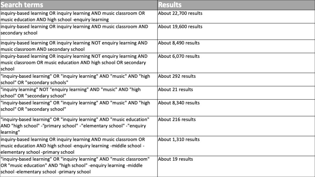 Firstly, as many people do, I went to Google to see what I could find.  Searching with google can have its moments and refining searches on google can be challenging unless you know how to narrow the searches.  Google found some useful results, especially in regard to professional sources. My initial search of inquiry and music found 193 million results, many of which were not very useful. Then the process of narrowing the search began.  Employing an advanced search strategy for example a Boolean search can assists in narrowing searches and returning relevant results.  Adding and, or, not, + (add) or – (subtract/not) between the keywords assist in refining the results. This advanced search strategy was used when searching in Google.  The table below shows the variety of search terms entered and the results they returned.